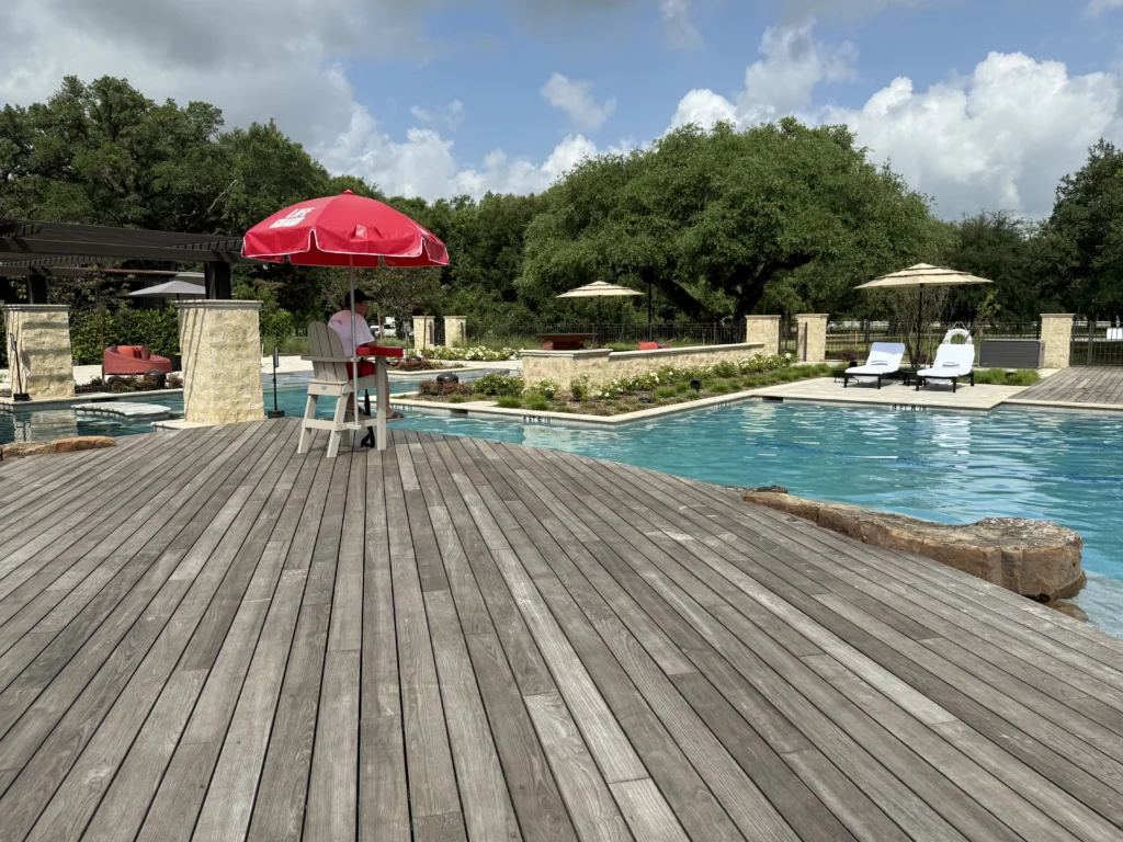 Just off the main deck, a raised Benchmark Ash pool island adds both form and function. It doubles as a lounging platform for swimmers and a lifeguard station—all while withstanding moisture, sun, and foot traffic with ease. No shoes, no splinters, no worries!